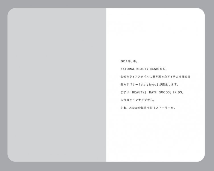 NATURAL BEAUTY BASICから生まれた ホームケア + キッズラインブランドのネーミングから開発。 立ち上がり時、商品のストーリーを書いたコンセプトブックを全国店頭で配布。